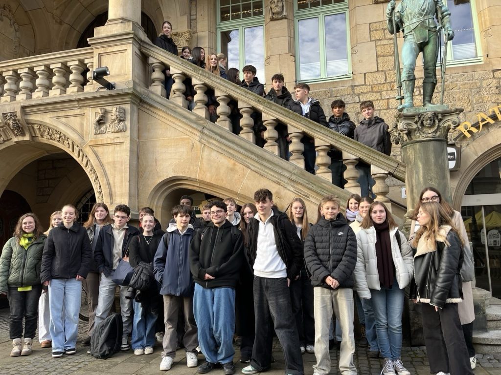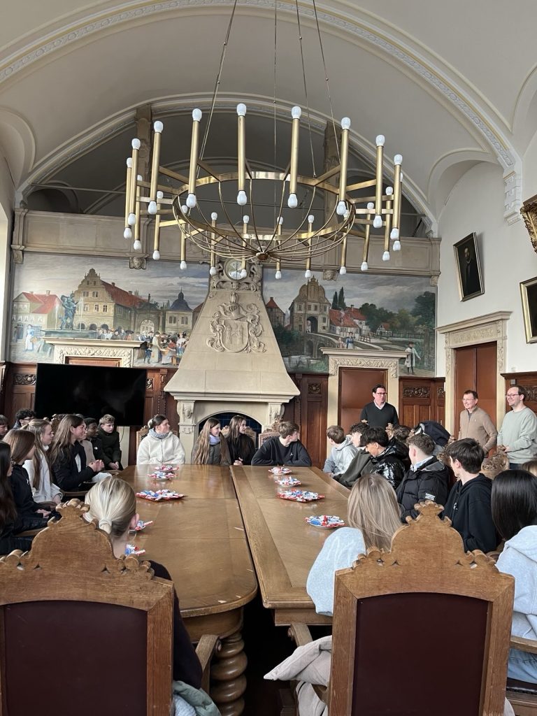 Nach der Ankunft am Donnerstagabend begann der Austausch am Freitag mit einer Begrüßung durch unsere Schulleiterin Frau Kastning. Die Gäste erhielten eine Schulführung durch eine Französischgruppe von Frau Bucher aus Jahrgang 8. Der anschließende Empfang im Historischen Rathaussaal durch den Bürgermeister der Stadt Bückeburg, Herrn Wohlgemuth, hat die Bedeutung internationaler Austauschbegegnungen unterstrichen. Ein Highlight dabei war der Blick über Bückeburg vom Rathausdach aus. Das anschließende Wochenende verbrachten die französischen Schülerinnen und Schüler in ihren Gastfamilien. Hier blieb viel Zeit, den Alltag kennenzulernen und Ausflüge in die Region zu unternehmen. Vielen Dank an dieser Stelle an die Gastfamilien, die sich während der Woche um die französischen Gäste gekümmert haben.