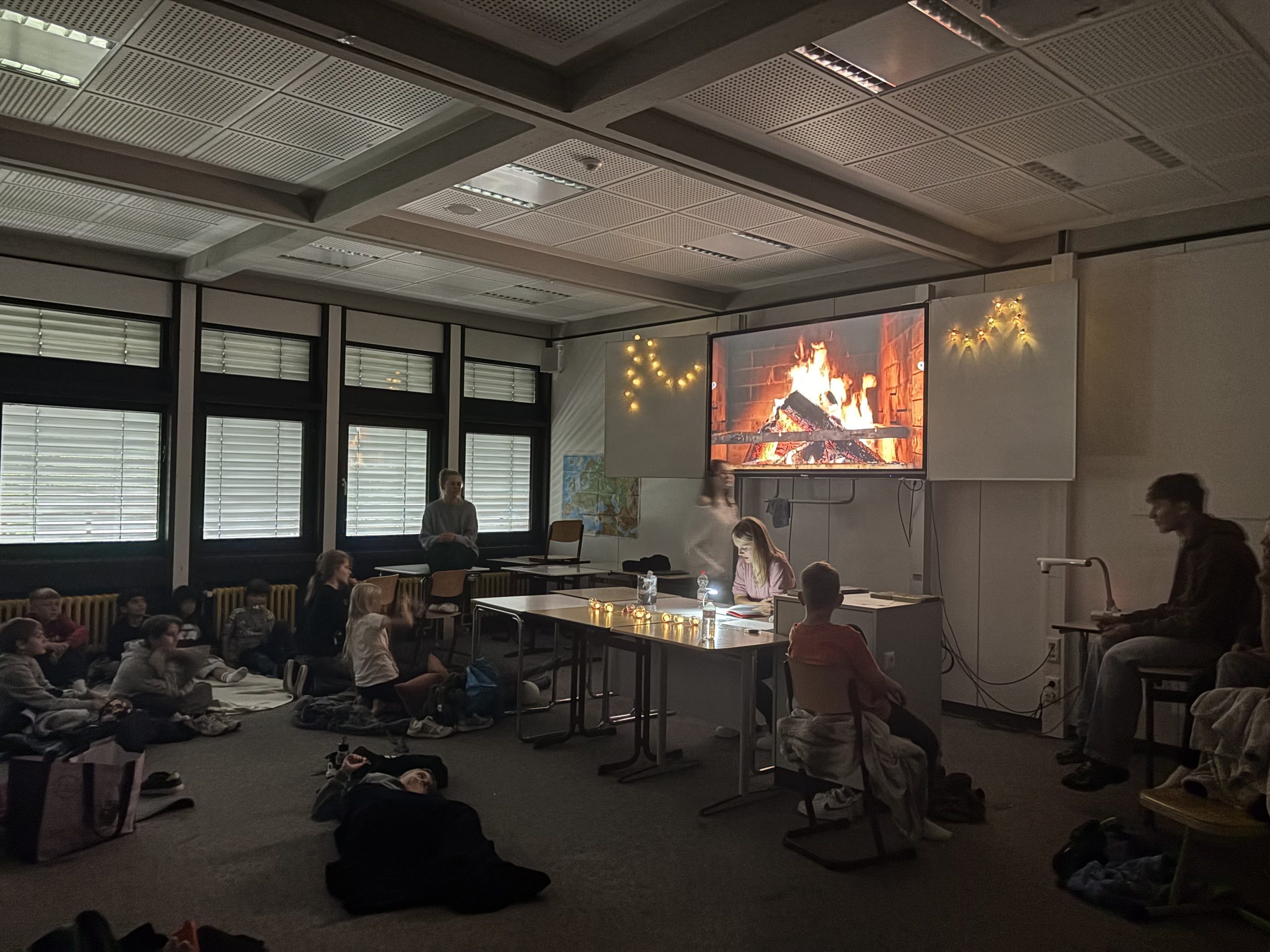 Bibliothek, Theaterraum und Bühne des Adolfinum lagen gestern Abend in einem geheimnisvollen Dunkeln. Nur ein paar Lichterketten verbreiteten ein warmes Licht. Im Raum 206 standen keine Stühle mehr, dafür brannte an der Tafel ein einladendes (digitales) Feuer. Die neuen Paten und Patinnen des 10. Jahrgangs hatten liebevoll Räume für 60 Fünftklässler vorbereitet, in denen später Geschichten aus der Tierwelt vorgelesen wurden.
