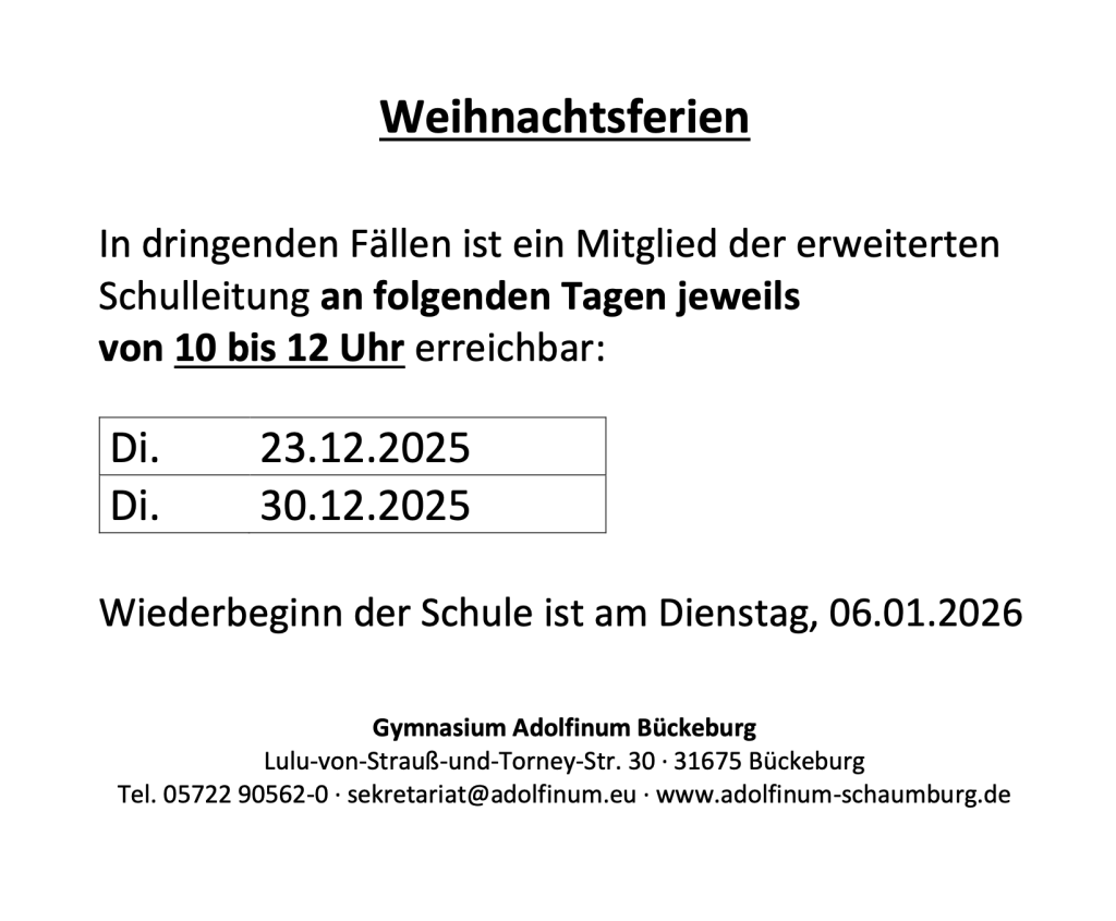 Aus dem Schulleben Erreichbarkeit der Schule in den Weihnachtsferien von Lara Dübner 18. Dezember 2025 18. Dezember 2025 59
