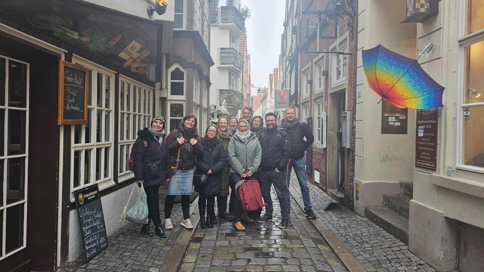 Mit 17 gut gelaunten Lehrkräften machten wir uns Freitag auf den Weg zu einem gemeinsamen Ausflug in die Hansestadt Bremen. Im Mittelpunkt standen das Miteinander, der Austausch abseits des Schulalltags und natürlich das Genießen. Ein besonderes Highlight war die Führung durch die Brauerei Hopfenfänger. Mit viel Fachwissen und Humor erhielten wir spannende Einblicke in die Kunst des Bierbrauens – von den Rohstoffen bis zum fertigen Produkt. Die entspannte Atmosphäre bot reichlich Gelegenheit für Gespräche und gemeinsames Lachen. Am Abend ließen wir den Tag in einer italienischen Pizzeria ausklingen. Bei Pizza, Pasta und guten Gesprächen wurde der kollegiale Zusammenhalt weiter gestärkt. Den nächsten Morgen begannen wir ganz stilvoll mit einem Frühstück im Schnoor Teestübchen. Inmitten der historischen Gassen genossen wir britische Hochkultur mit Tee, Scones und einer besonderen Ruhe, die einen wunderbaren Kontrast zum lebhaften Alltag bot. Frau Böning-Spohr hat die Kollegen außerdem sehr informativ durch die Sehenswürdigkeiten der Stadt geführt. Der Ausflug nach Bremen war für alle Beteiligten eine bereichernde Erfahrung, der die Gemeinschaft gestärkt und viele schöne Erinnerungen geschaffen hat.