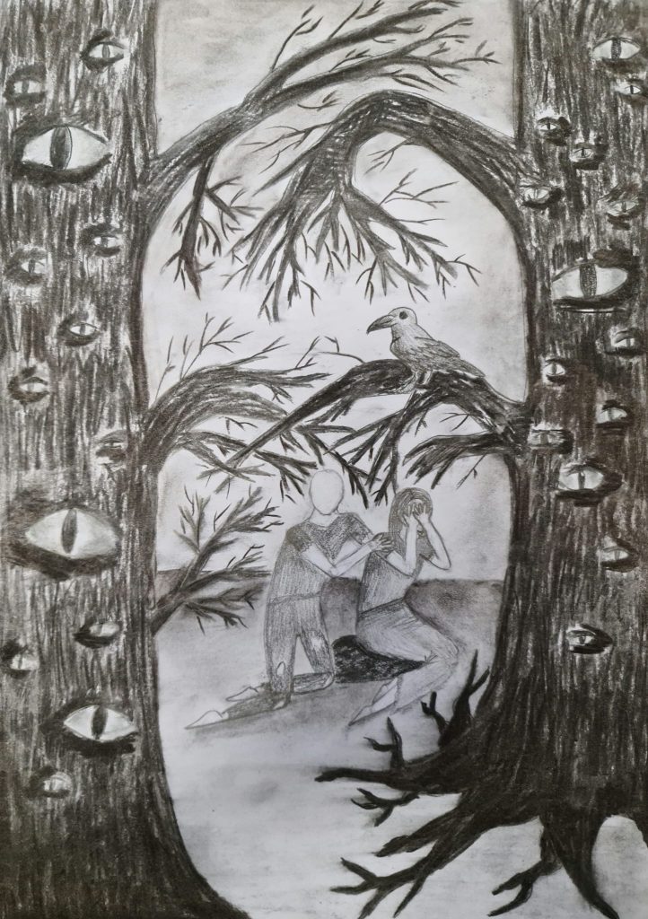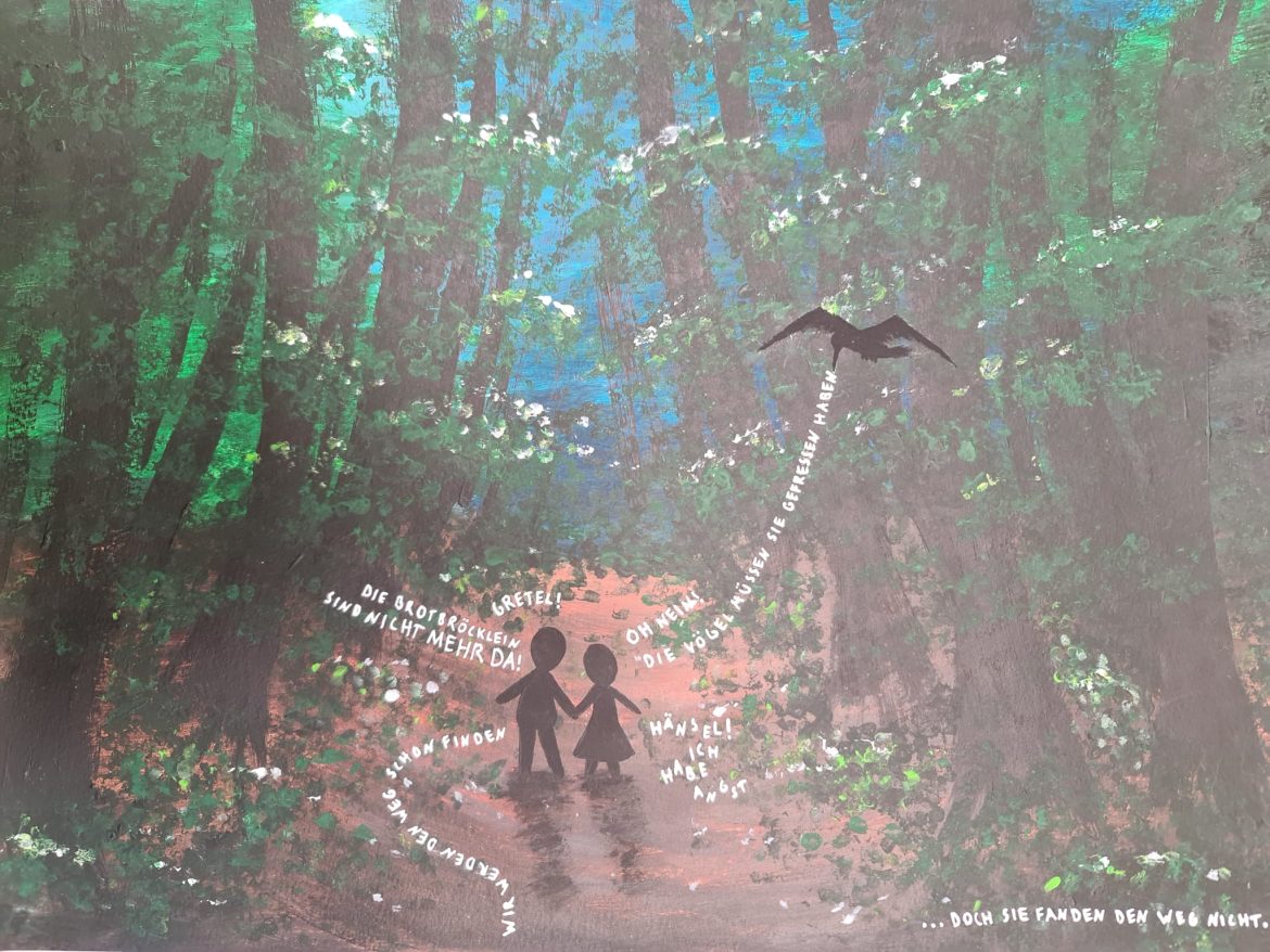 Aufmerksamen Schlenderern dürfte aufgefallen sein, dass neue Bilder die Wand vor dem Lehrerzimmer zieren. Thematisch beziehen sich die mit verschiedenen Techniken – Acryl, Zeichenkohle, Graphitstift, Pastellkreide – gemalten und gezeichneten Werke allesamt auf das Grimm’sche Märchen Hänsel und Gretel, genauer auf die düstere Episode der Aussetzung der Kinder im Wald. Sehr eindrücklich stellen sowohl die Schülerinnen und Schüler des 12. als auch 13. Jahrgangs auf grundlegendem Niveau die Ängste in eigener Interpretation dar. Ein Blick auf die Originale lohnt sich!
