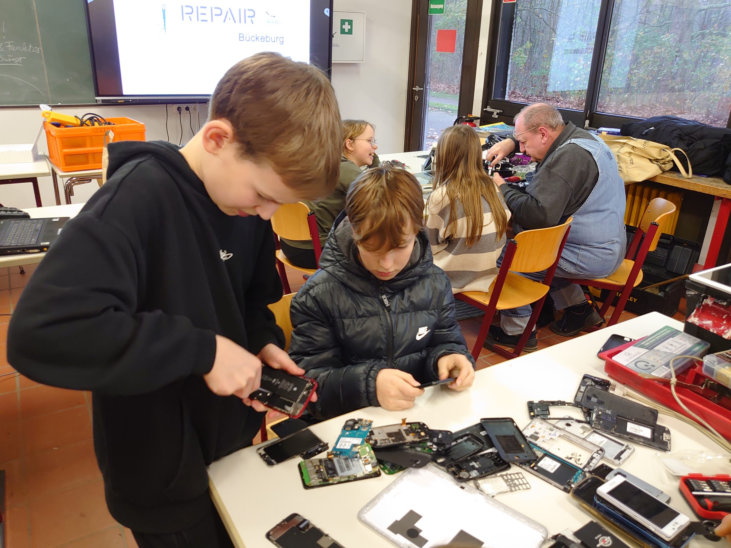 Wie sicherlich alle an den Schrottbergen im Eingangsbereich bemerkt haben, läuft die Aktion „E-Waste-Race“ der Zukunftswerkstatt auf Hochtouren. Gestern durfte sich die AG über besonderen Besuch freuen: Kathrin Prade, eine der drei Organisatorinnen des Bückeburger Repaircafés, kam gemeinsam mit sechs ehrenamtlichen Reparateuren in den Kunstraum der Schule – der sich für einen Vormittag in eine echte Werkstatt verwandelte.