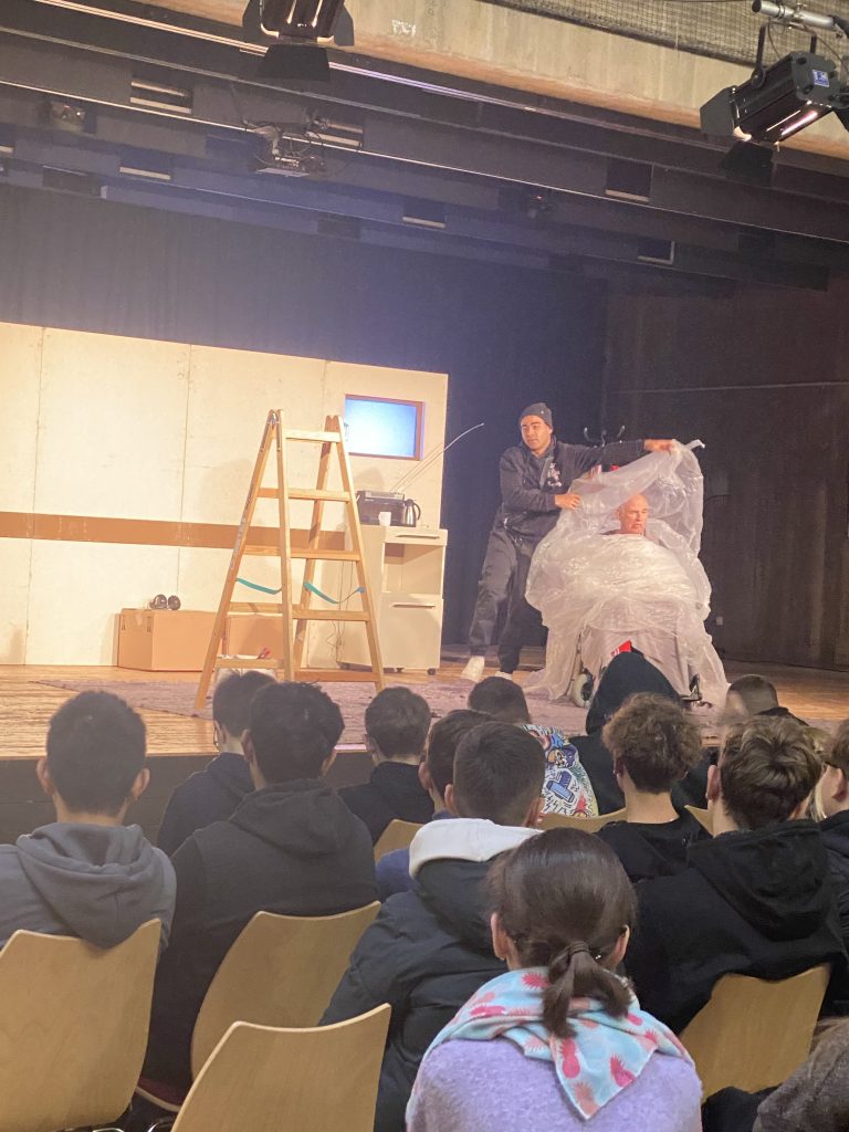 Das Drama „Das Herz eines Boxers“ von Lutz Hübner, veröffentlicht im Jahr 2008, ist eine sogenannte Tragikomödie. Diese Tragikomödie wurde am 03.11.2025 vom Jungen Theater Göttingen in der Aula des Gymnasium Adolfinum in Bückeburg für alle 8. Klassen aufgeführt.